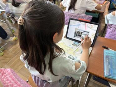 社会科では、「日本の国土とわたしたちのくらし」について学習しています。地球儀を活用して、世界の国々との位置関係を調べたり、日本の国土の広がりをまとめたりしました。ニュースで見聞きした国名や外国料理店での食事など、自分の生活や経験と結びつけながら考えを深めている場面もありました。