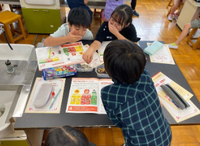 水遊びを行う前に、水鉄砲になりそうなものの意見を出し合い準備をしたり、水遊びを楽しむために工夫して的を作ったりしました。 みんな笑顔いっぱい楽しく遊ぶことができました。