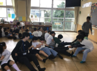 羽村市動物公園の生活科見学に向けて、2年生と顔合わせを行いました。グループごとに集まり、自己紹介と班のめあて決め、フラフープ送りリレーをしました。