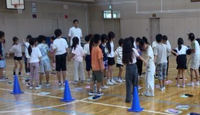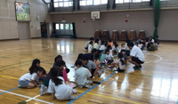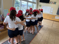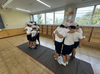 体育の授業で、みんなで力を合わせて新聞紙に乗ったり、フラフープをつないだりしました。「もう少し近くに寄って」「こうしたら早く次の人に回せるよ」などお互いに声を掛け合い、協力して取り組む姿が見られました。